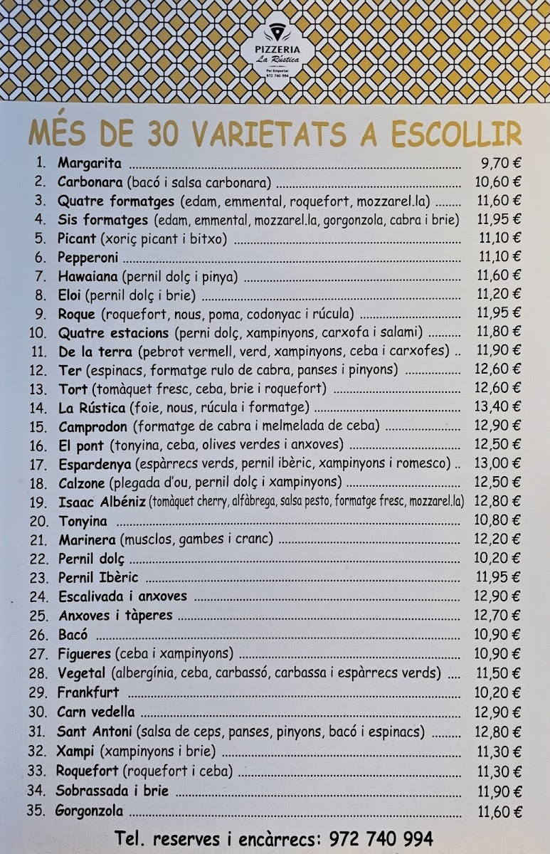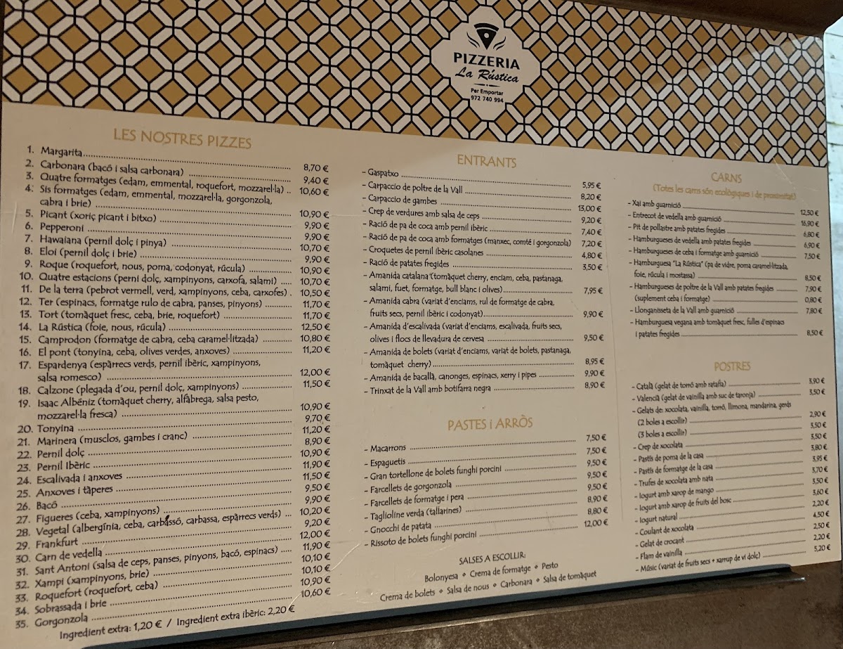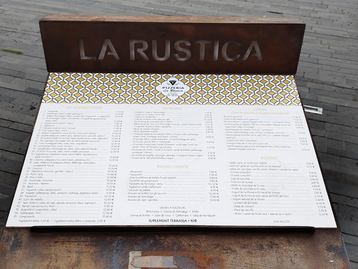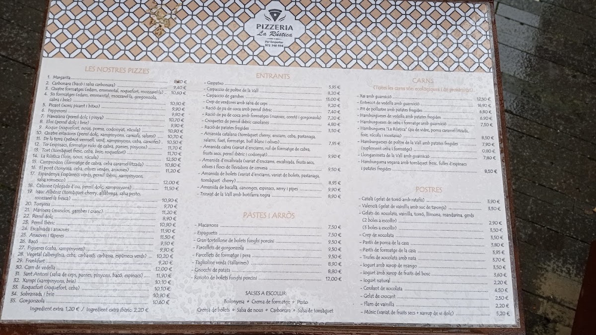 Welcome to Pizzeria-Restaurant 'La Rustica', a gem located on Carrer Catalunya in the charming town of Camprodon, Girona, Spain. This quaint pizzeria is renowned for its cozy atmosphere and dedicated staff who prioritize customer satisfaction. Diners rave about the extensive pizza options, like the delightfully cheesy four cheese and savory pepperoni, both served in generous portions. Guests have also applauded the hand-made calzones, highlighting their crispy dough and robust flavors. Vegetarian options and homemade pasta provide a comforting variety, though some have expressed a desire for more accompaniments. The terrace seating beckons, making it an ideal spot to enjoy your meal al fresco. Despite occasional rush to accommodate walk-ins, the warm service remains a constant delight. Overall, La Rustica is highly recommended for its delicious offerings, welcoming vibe, and strong local following.